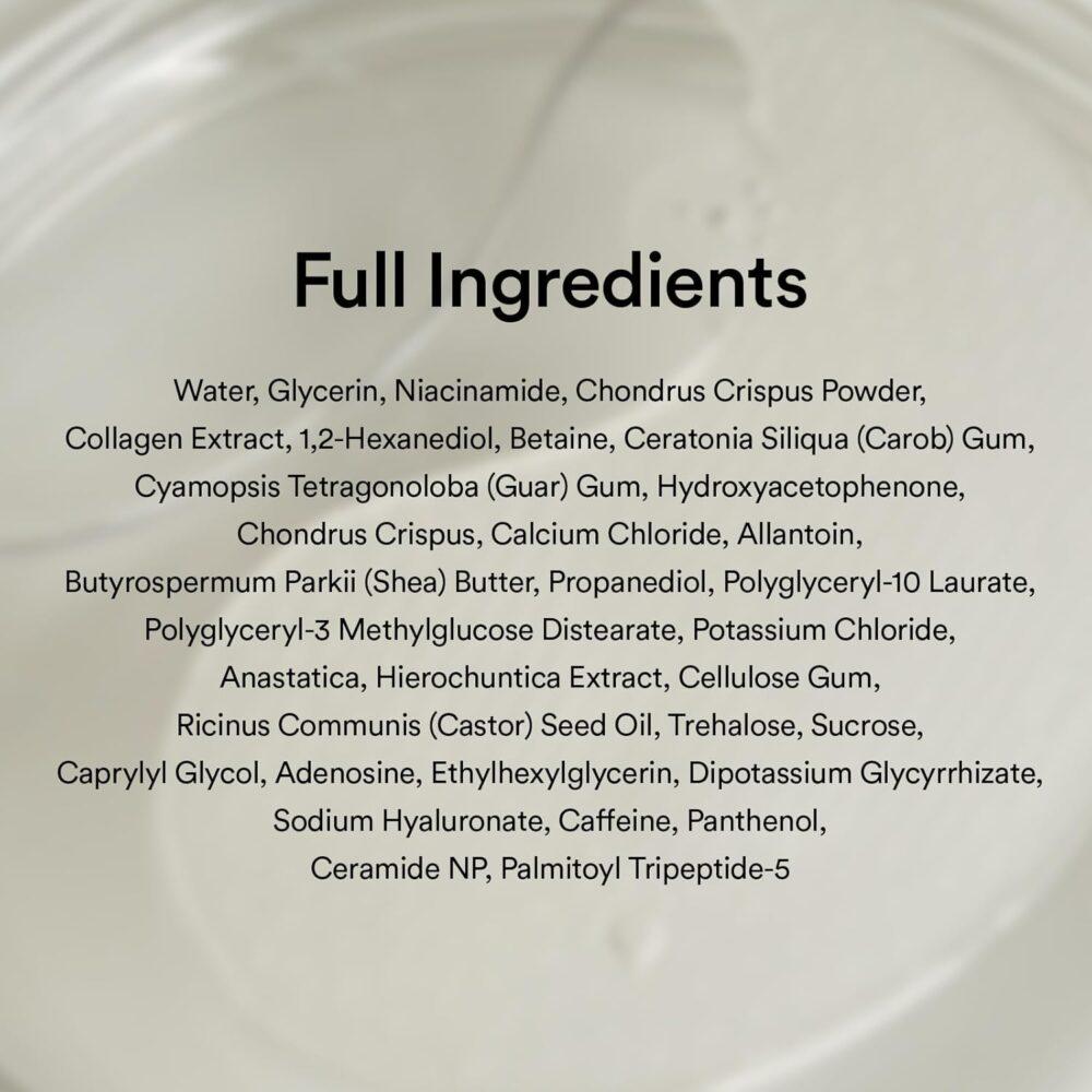 Water, Glycerin, Niacinamide, Chondrus Crispus Powder, Collagen Extract, 1,2-Hexanediol, Betaine, Ceratonia Siliqua (Carob) Gum, Cyamopsis Tetragonoloba (Guar) Gum, Hydroxyacetophenone, Chondrus Crispus, Calcium Chloride, Allantoin, Butyrospermum Parkii (Shea) Butter, Propanediol, Polyglyceryl-10 Laurate, Polyglyceryl-3 Methylglucose Distearate, Potassium Chloride, Anastatica, Hierochuntica Extract, Cellulose Gum, Ricinus Communis (Castor) Seed Oil, Trehalose, Sucrose, Caprylyl Glycol, Adenosine, Ethylhexylglycerin, Dipotassium Glycyrrhizate , Sodium Hyaluronate, Caffeine, Panthenol, Ceramide NP, Palmitoyl Tripeptide-5