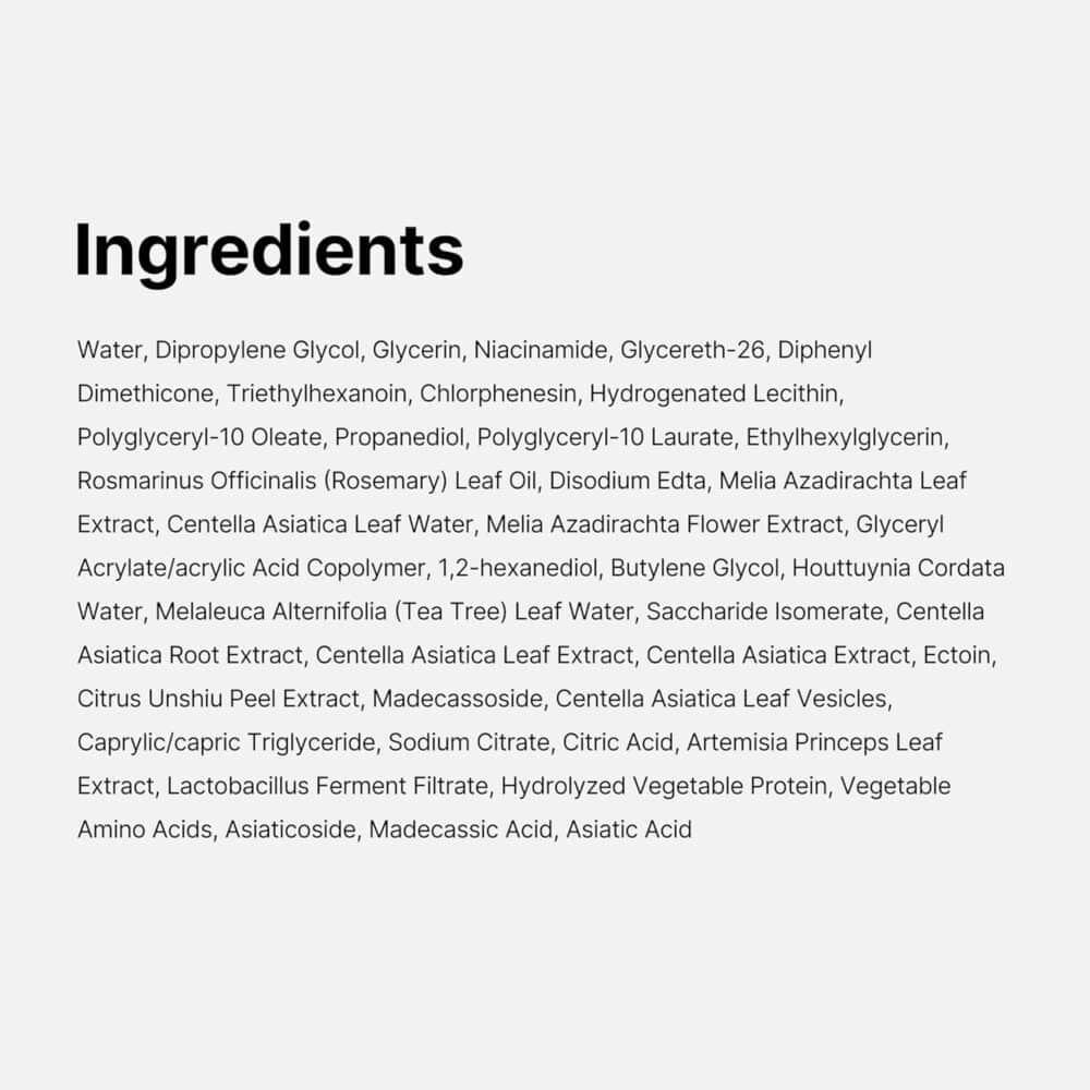 Water, Dipropylene Glycol, Glycerin, Diphenyl Dimethicone, Triethylhexanoin, Hydrogenated Lecithin, Polyglyceryl-10 Oleate, Niacinamide, Glycereth-26, Chlorphenesin, Glyceryl Acrylate/Acrylic Acid Copolymer, 1,2-Hexanediol, Propanediol, Polyglyceryl-10 Laurate, Ethylhexylglycerin, Disodium EDTA, Melia Azadirachta Leaf Extract, Melia Azadirachta Flower Extract, Rosmarinus Officinalis (Rosemary) Leaf Oil, Centella Asiatica Leaf Water, Centella Asiatica Extract, Centella Asiatica Leaf Extract, Centella Asiatica Root Extract, Madecassoside, Caprylic/Capric Triglyceride, Saccharide Isomerate, Hydrolyzed Vegetable Protein, Lactobacillus Ferment Filtrate, Asiaticoside, Asiatic Acid, Madecassic Acid, Vegetable Amino Acids, Butylene Glycol, centella asiatica leaf vesicles, Houttuynia Cordata Water, Artemisia Princeps Leaf Extract, Melaleuca Alternifolia (Tea Tree) Leaf Water, Citrus Unshiu Peel Extract, Ectoin, Citric Acid, Sodium Citrate