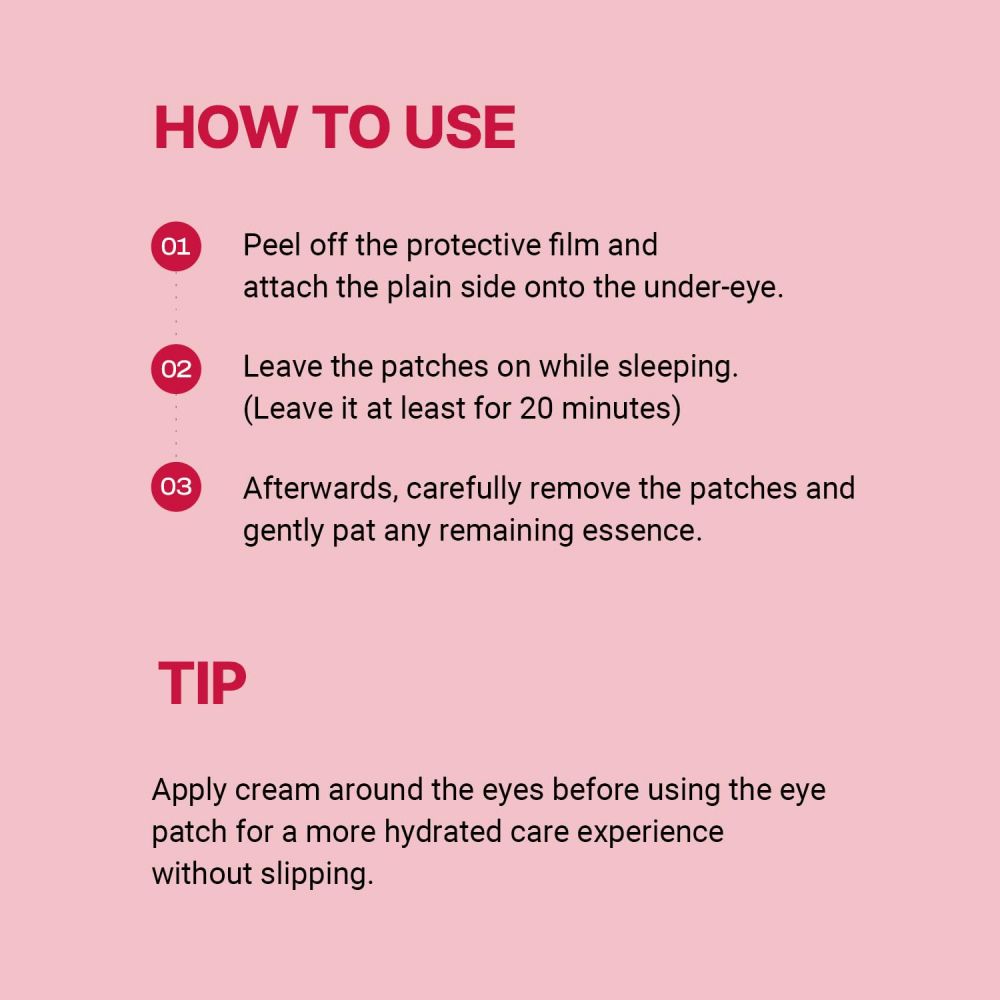 The patch works by delivering nourishing ingredients like collagen and hyaluronic acid to the skin, helping to plump, hydrate, and firm the eye area, reducing the visible signs of aging.